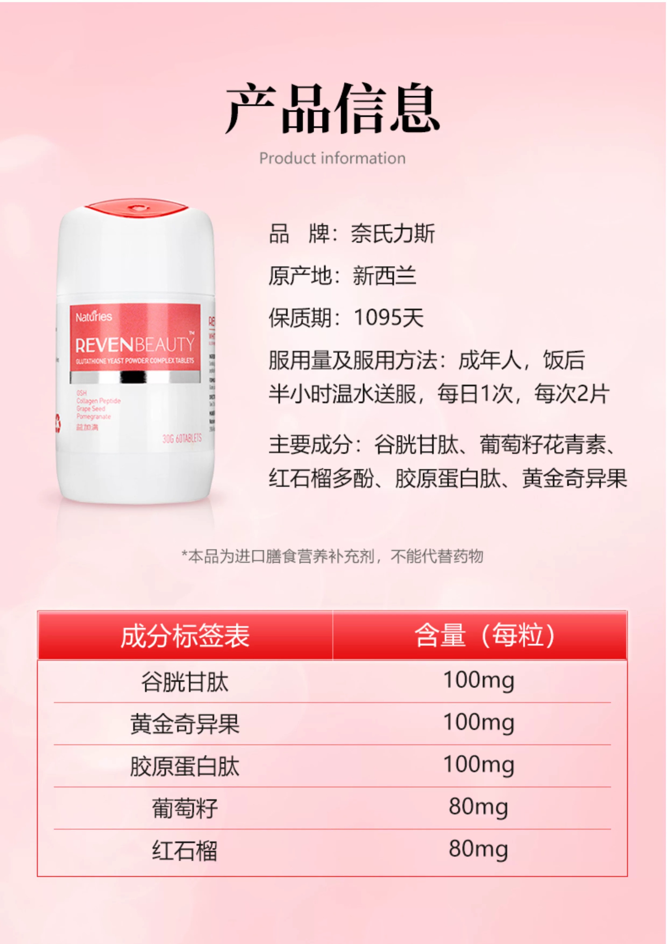 【买二送一 此为单盒链接】Naturies Reven Beauty 谷胱肽酵母鱼胶原蛋白葡萄籽口服片60片 淡斑美肤 保质期2026.3