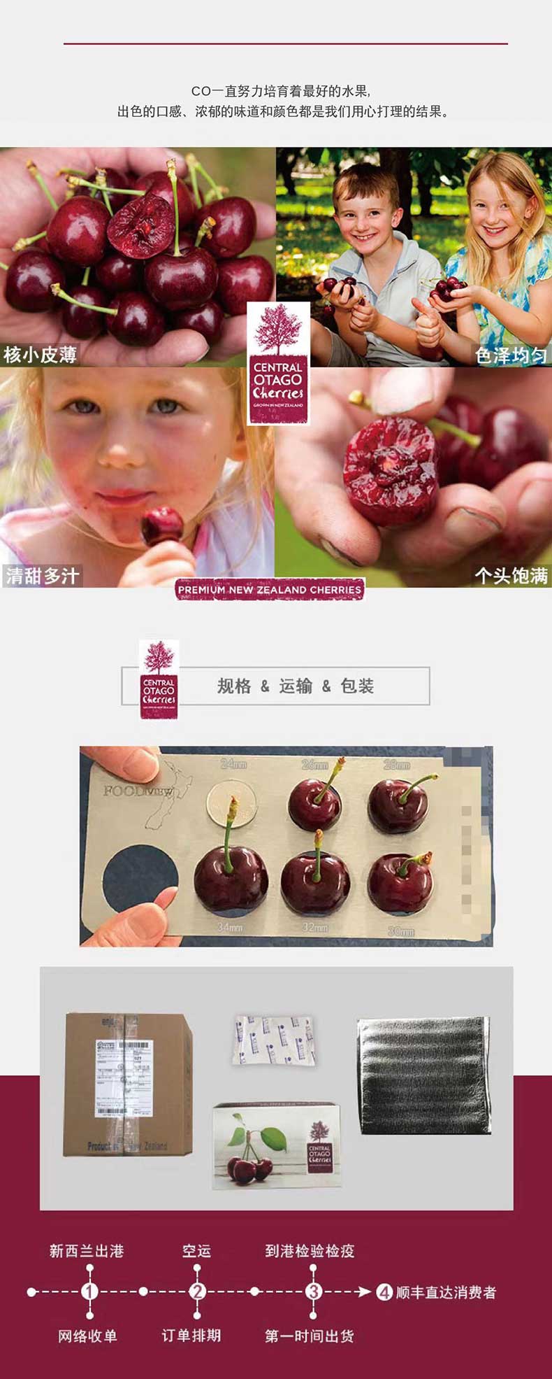 【排单发货】【仅接受人民币付款】新西兰 CENTRAL OTAGO樱桃车厘子2kg 32-34mm(新疆/西藏/青海不接单,全国无偏远收费)
