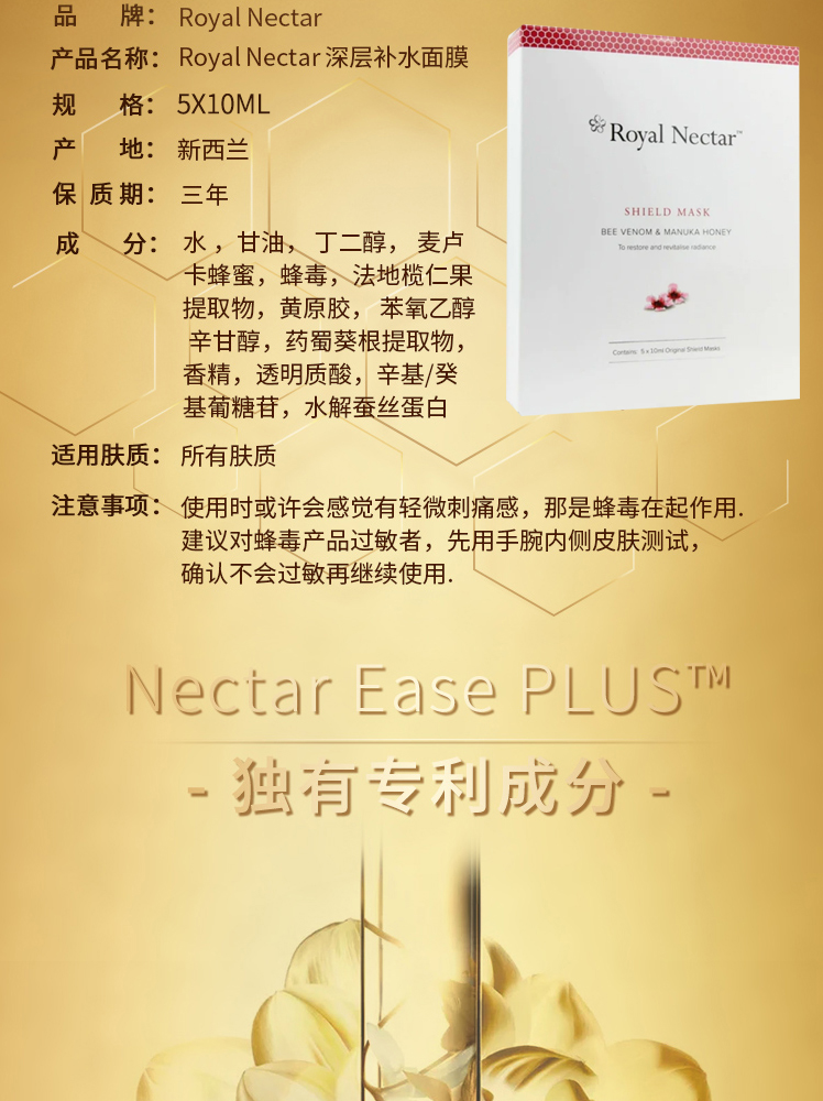 Royal Nectar 皇家花蜜系列 蜂毒面膜 50ml <皇妃凯特同款>天然的肉毒杆菌代替品Royal Nectar新西兰Nelson Honey and Marketing (NZ) Ltd. 公司旗下的护肤品牌,主要产品有蜂毒面膜、面霜等产品。Nelson Honey 是英国著名..